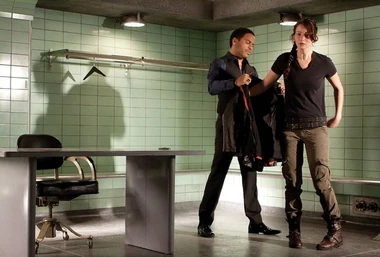 Cinna enlace Katniss avant qu'elle n'entre dans l'arène.