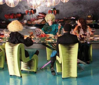 Cinna informe Katniss et Peeta au sujet de leurs combinaisons avant de les allumer.